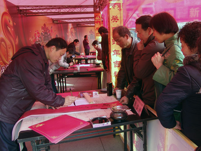 2月2日至7日,我校郭宝禄等省、市书法家协会的近百名书法家应邀参加在大唐西市现场为市民免费写春联、送春联的大型公益活动,为蛇年新春佳节送上一份份浓浓的祝福。在活动中,他和其他书法家们云集大唐西市广场,由于市民人山人海、络绎不绝,需求的市民在书写台前始终排队排得很长,加上天气寒冷,有时冻得手脚麻木,一站几个小时,忙得连水都顾不上喝,始终马不停蹄地书写着。为写好每副春联,他带上自己的笔尺毡等工具外,还提前准备好打印蛇年春联资料,供市民参考,他书写的春联和“福”字内容丰富、书体多样,大气吉祥,深受广大市民喜爱,共为市民送春联、福300余副/幅,为喜迎蛇年奏响了浓浓的序曲。