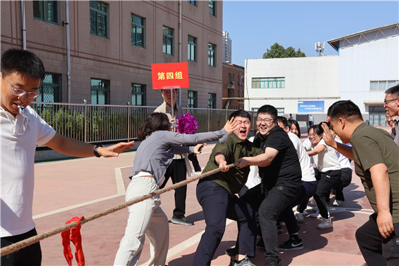 作为开幕后的首个竞技项目就是力量与策略的交锋,“拔河比赛”瞬间将气氛推向高潮。当裁判哨声响起,双方队员身体后仰、青筋暴起,麻绳中央的红绸在临界线上反复拉锯。这场较量不仅展现了力量的博弈,更成为一堂生动的“实践课”。队友们的加油声、呐喊声此起彼伏,现场气氛瞬间被点燃。