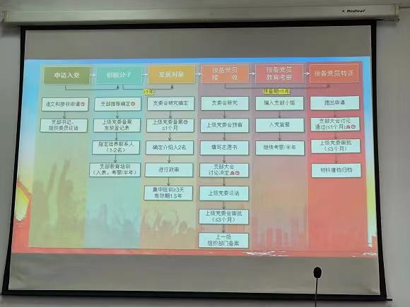 讲座进入重要阶段,袁利杰老师向大家详细介绍了发展党员工作的基本流程。他为大家详尽地分析了“申请入党”、“积极分子确定培养”、“发展对象确定培养”、“预备党员接收”、“预备党员教育考察”和“预备党员转正”这六个阶段中的25个步骤和注意事项,使同学们明确了整个党员发展过程的时间周期和节点,并强调了发展党员工作的总体要求,要求各主体务必思想端正、材料完备、程序严谨、逢会必开、开会必记、记录必全。随后,袁利杰老师向大家介绍了自己工作中处理的案例,强调了发展党员工作的纪律要求。