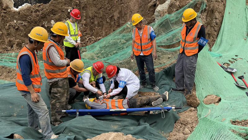 为确保演练顺利开展,活动制定了科学严谨的演练方案,精心布置活动场地,演练模拟了基坑开挖施工过程中因开挖不当造成坍塌、人员受伤等场景。“险情”发生后,各小组人员按照预定计划迅速响应、各司其职,快速、高效、有序进行抢险救援工作。抢险救援人员对伤员进行伤口包扎,并迅速将其转移至救护车内;监测巡查人员全面排除现场其他危险因素,各小组之间沟通顺畅、协作紧密,演练活动顺利完成。